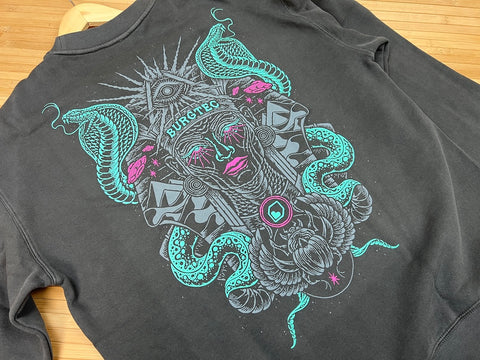 Introducing our new Desert Queen print, where ancient Egyptian mystique meets futuristic adventure. This striking design features a powerful Egyptian woman framed by towering pyramids, intertwined serpents, and mysterious flying saucers. The psychedelic colour scheme creates a vibrant fusion between history and the unknown—perfect for those who ride fearlessly on the trails and embrace the spirit of adventure.