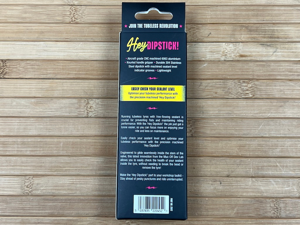 Mit dem präzisionsgefertigten „Hey Dipstick!“ kannst du ganz einfach den Füllstand deiner Dichtungsmasse überprüfen und die Leistung deines Tubeless-Reifens optimieren.